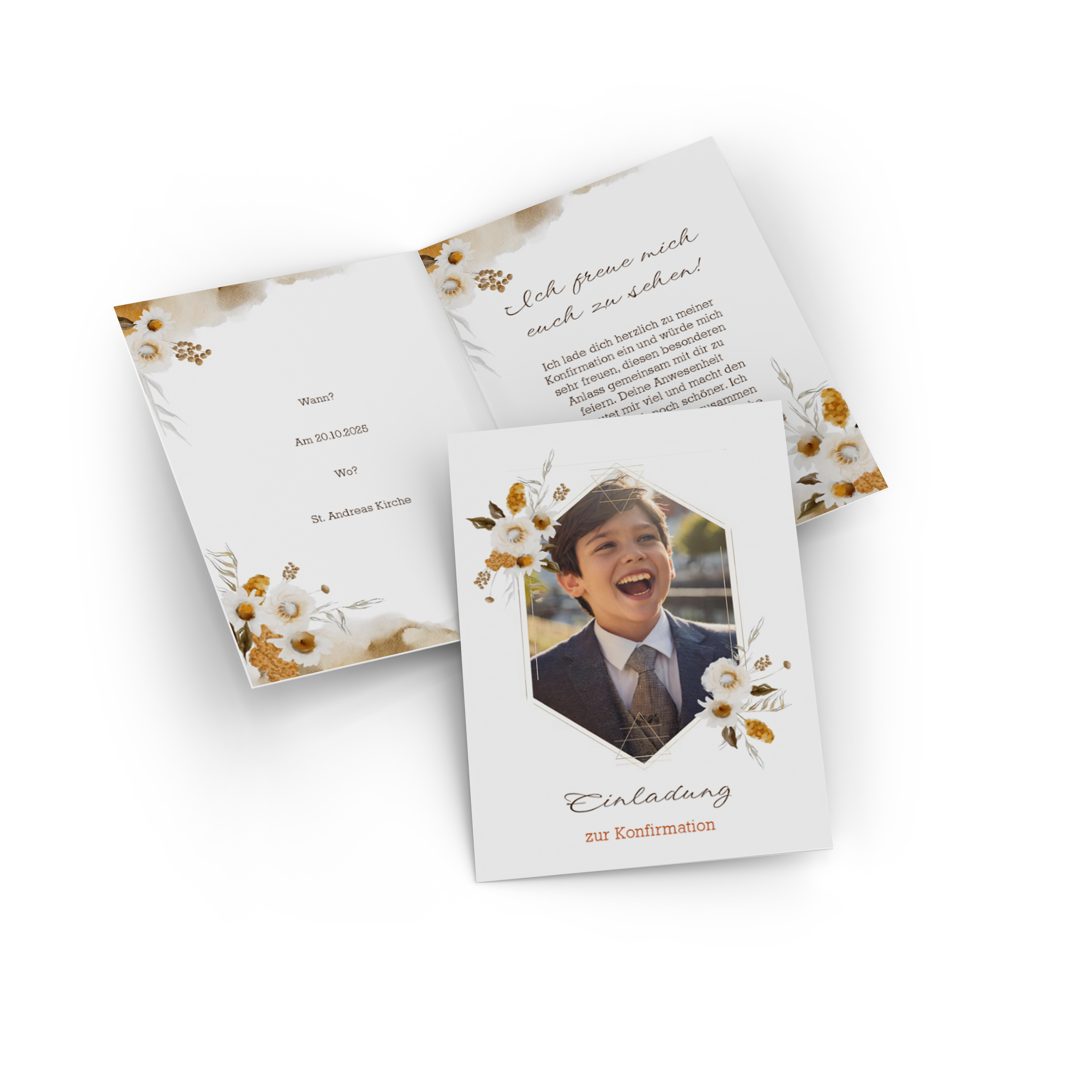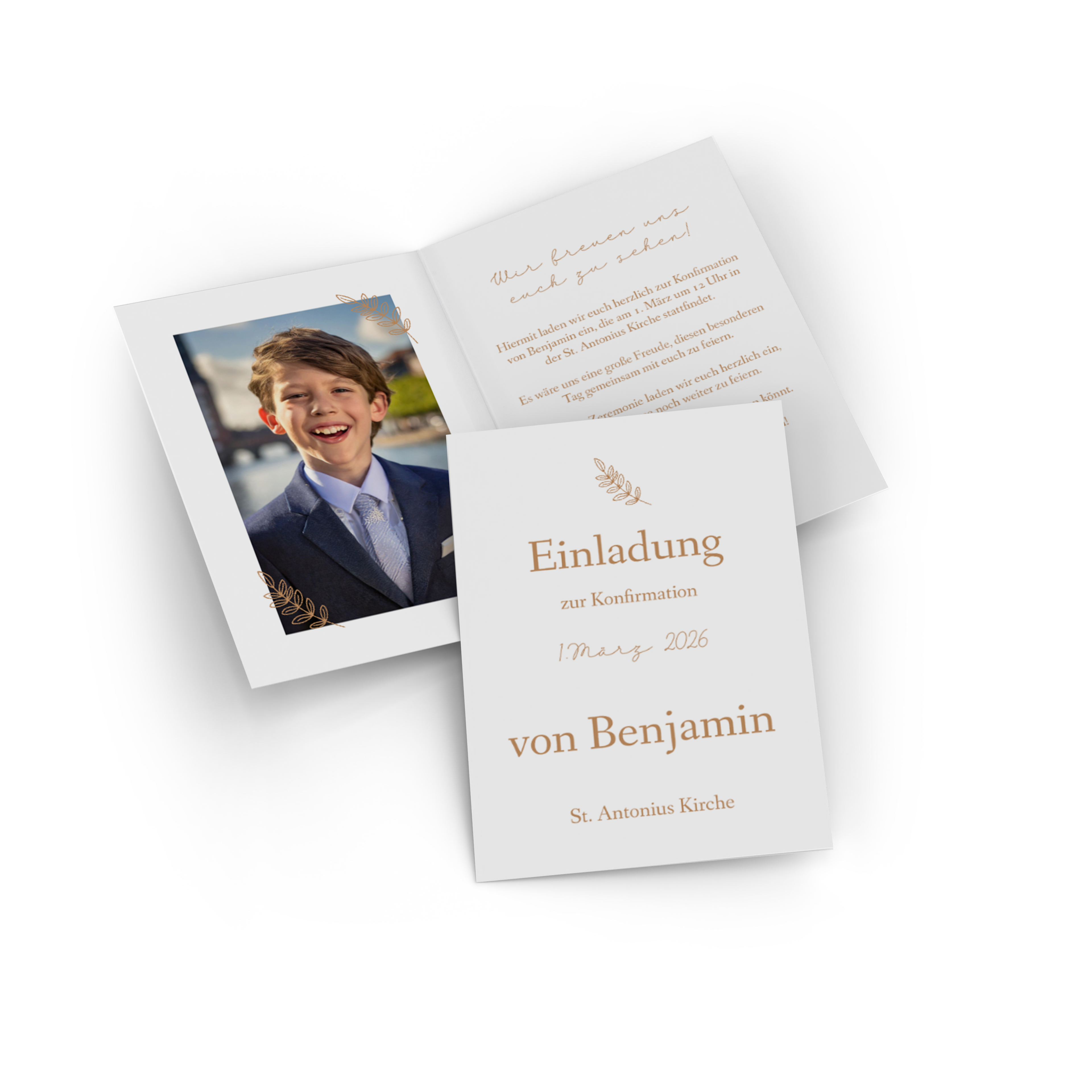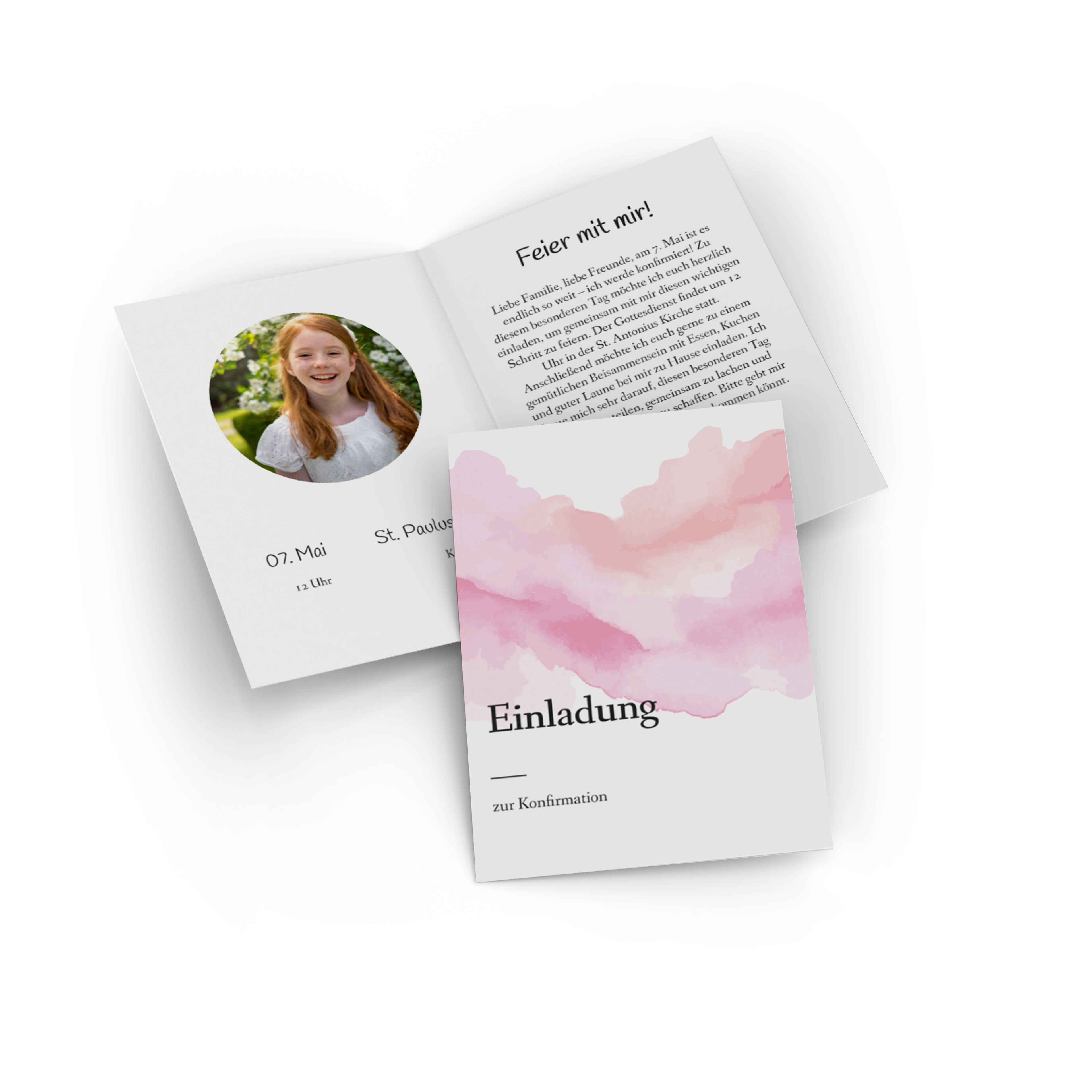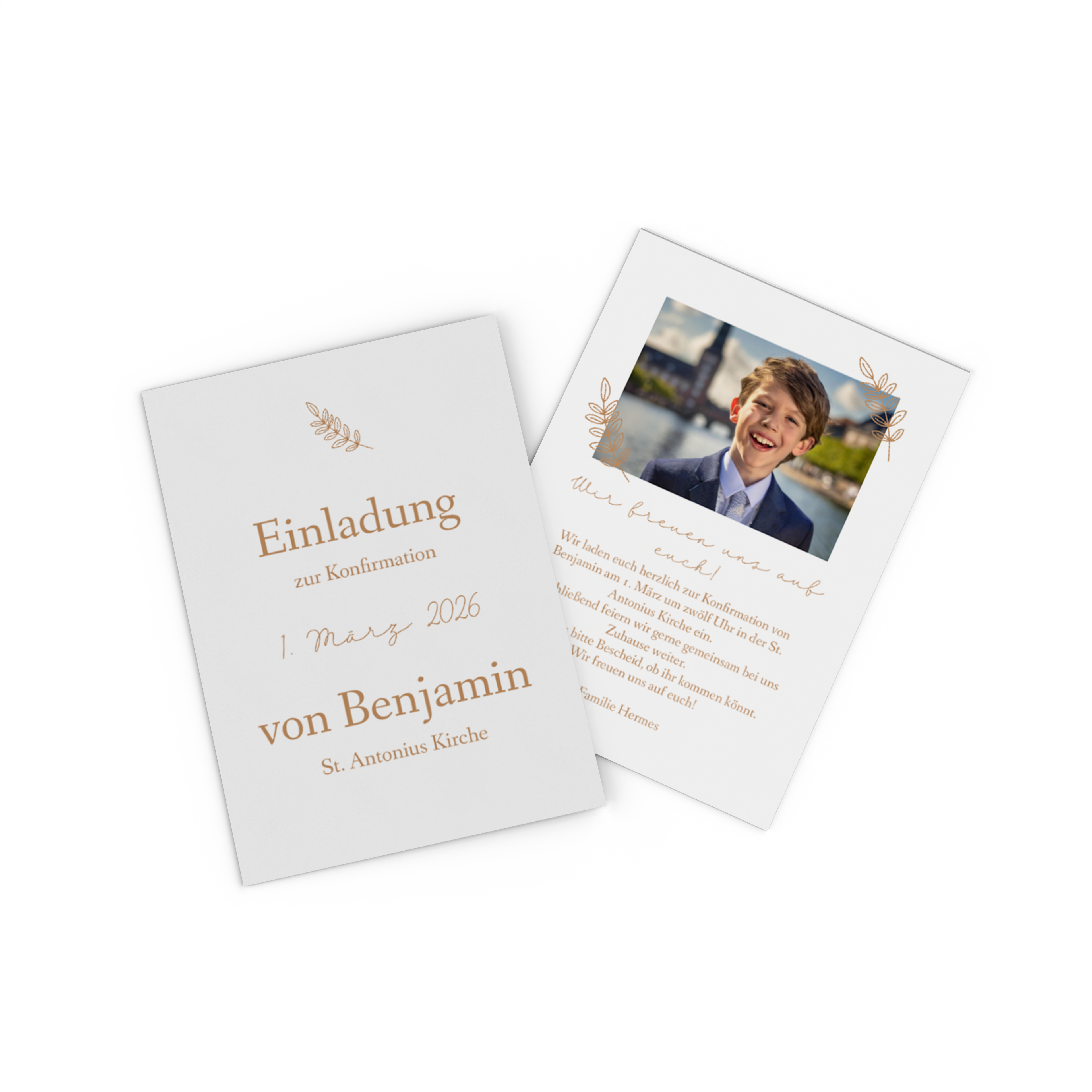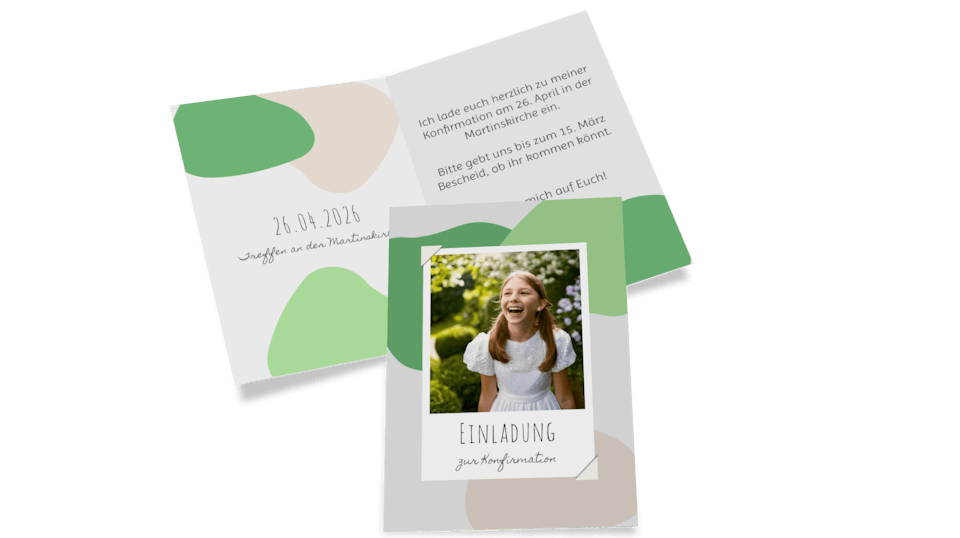 Mit Pixum gestaltest du Konfirmationseinladungen individuell und ganz nach deinem Geschmack. Lade die gewünschten Fotos hoch, passe Texte, Farben und Schriften an und verleihe deinem Design den letzten Feinschliff.