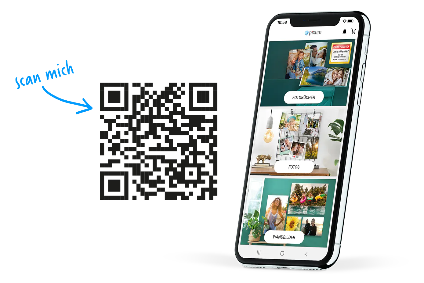 Scanne einfach den QR-Code mit deinem Smartphone und du kommst direkt zur Pixum App in den Store. Einfacher geht's nicht.