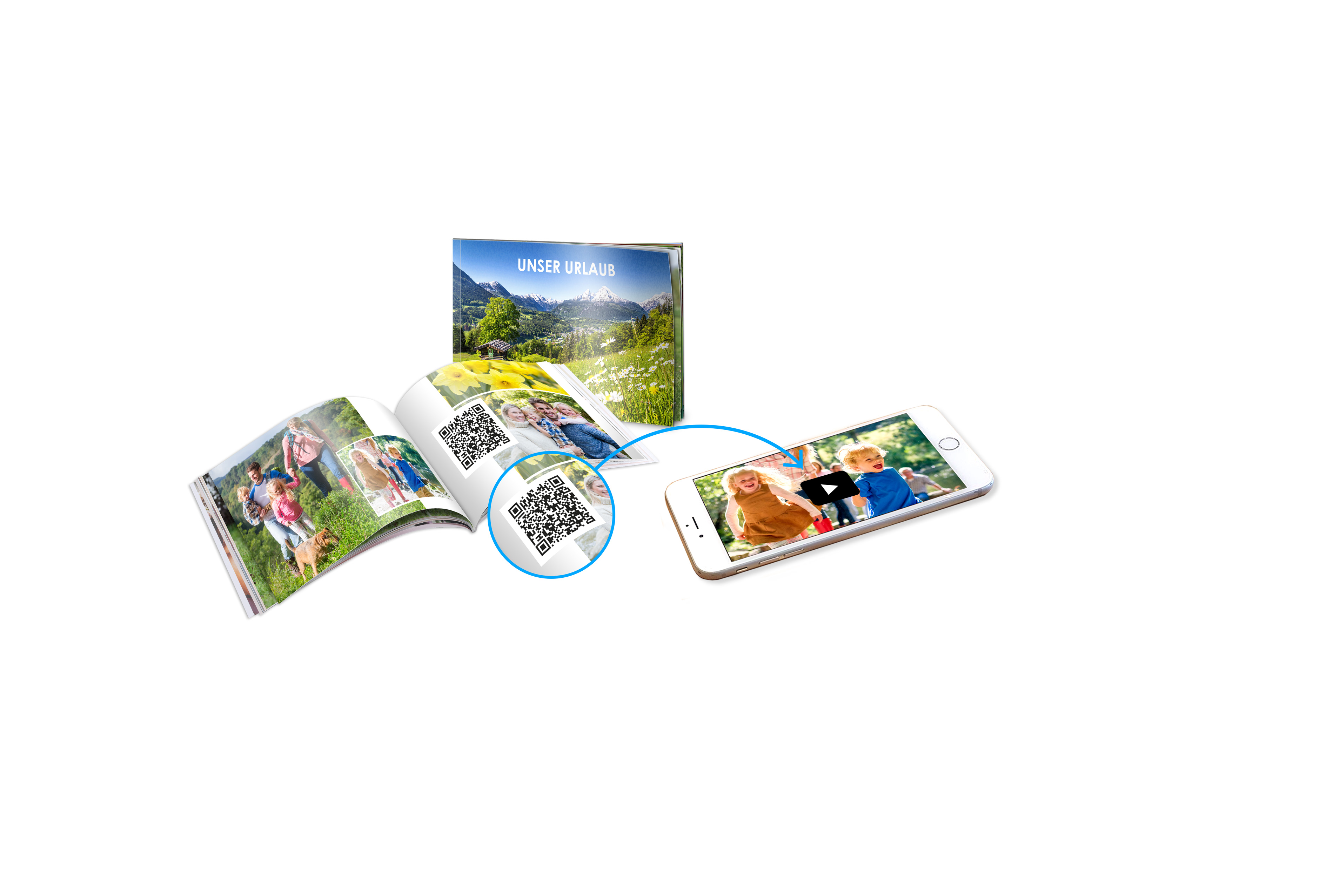 Videos ins Fotobuch? Wie soll das denn gehen? Mit einem QR-Code wird es möglich! Mit dem Smartphone oder Tablet liest du einfach den QR-Code ein und schon wird das Video passend zum gerade angesehenen Fotobuch abgespielt.